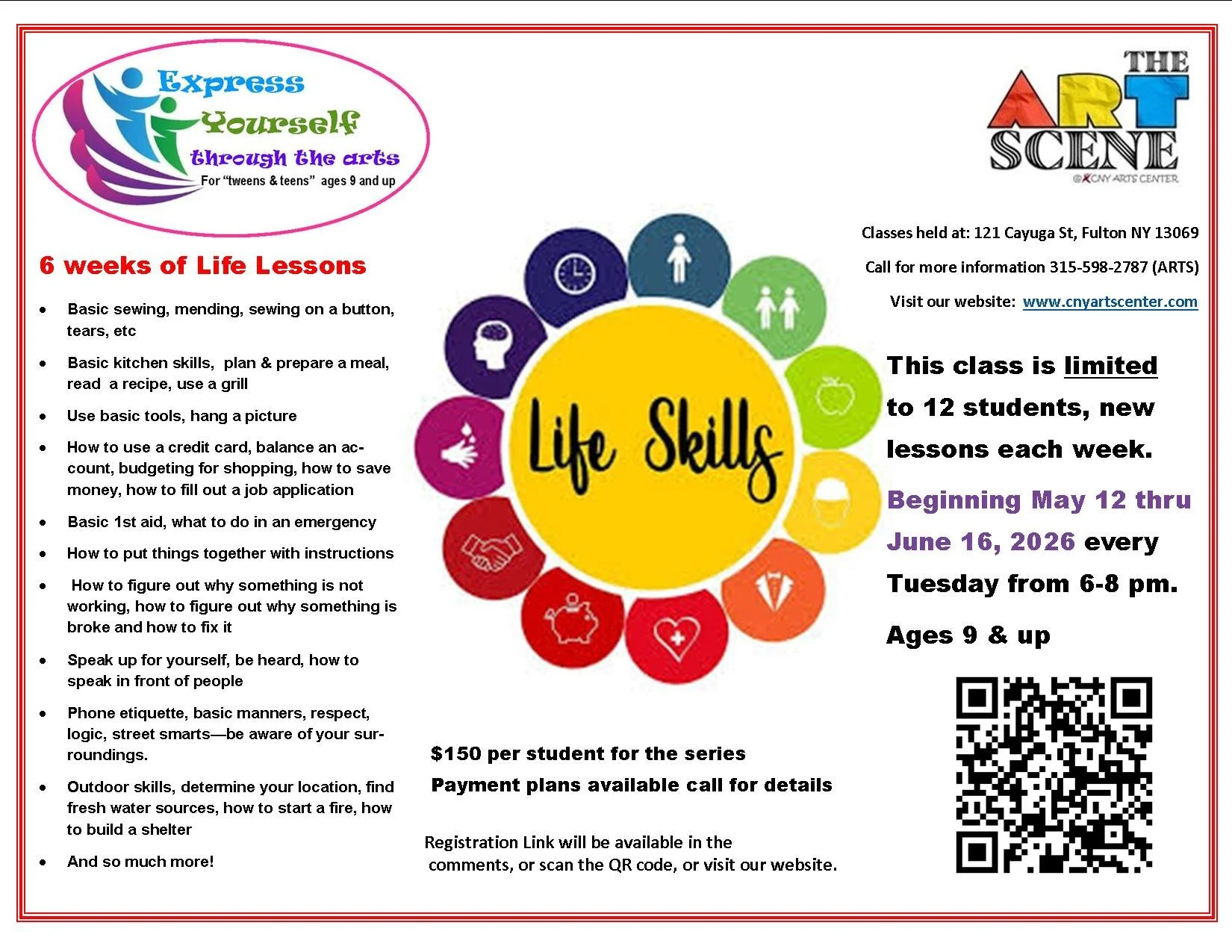 Life Skills For Kids Tuesday, May 12, 2026 6:00 PM 8:00 PM 18:00 20:00 CNY Arts Center 121 Cayuga St Fulton, NY, 13069 United States (map) Google Calendar ICS https://events.ticketleap.com/tickets/cnyartscenter/kids-life-skills